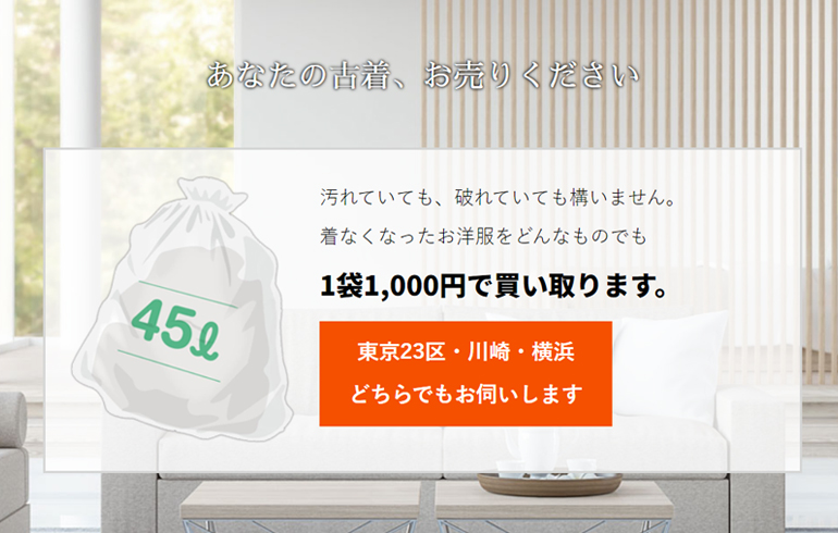 当サイトでの口コミ人気が高く不要な洋服をごみ袋に詰めるだけで1袋1,000円で買い取ってもらえます。 実際に私も「数年間着用した肌着」「ヨレヨレのTシャツ」「毛玉だらけのセーター」などを買い取ってもらい大満足でした。さらに高評価だったポイントとしては『この洋服は+1,200円で買い取りします』と買い取りスタッフがおっしゃっていただけ捨てようと思っていた洋服をトータル2,200円で買い取っていただけました。無料出張買取なのも◎。